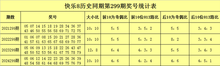 大小比分析:在历年第299期同期开奖中,奖号大小总比例为42:38,大号走势相对较热,去年同期号码大小比为10:10,大小 号码走势与理论差不多,今年第299期同期注意大号热出,关注大小比12:8。