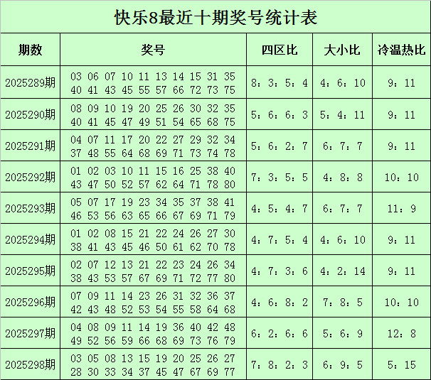 福彩快乐8第2025298期开奖回顾:03 05 08 13 15 19 20 25 26 27 28 30 33 34 37 45 47 67 69 77,其中奖号四区比为7:8:2:3,冷温热码比为6:9:5,大小比为5:15,和值为628,同尾号码为20 30、03 13 33、05 15 25 45、27 37 47 67 77、08 28、19 69。