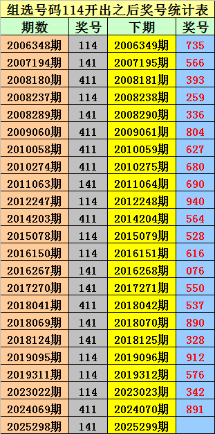 排列三组选114出现之后下期分别开出:735、566、393、259、336、804、627、680、690、940、564、528、616、076、550、537、890、328、912、576、342、891。