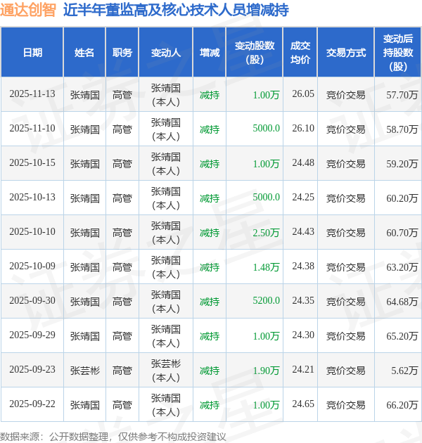 通达创智近半年内的董监高及核心技术人员增减持详情如下: